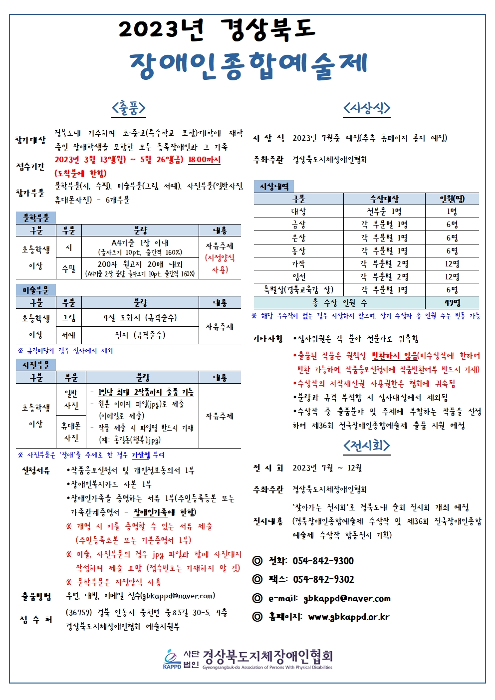 2023년 경상북도 장애인종합예술제 최고관리자 가족평생교육지원팀 0 852 2023.03.23 11:48 2023년 경상북도 장애인 종합 예술제 - 접수기간 : 2023.03.13(월)~05.26(금)- 참가대상 : 경북도내 거주하며, 초,중,고(특수학교 포함) 대학에 재학중인 장애학생을 포함한 모든 등록장애인과 그 가족- 공모부문 ▶문학부문: 시, 수필 ▶미술부문: 그림, 서예 ▶사진부문: 일반사진, 휴대폰 사진- 문의: 가족평생교육지원팀 070-4494-4262