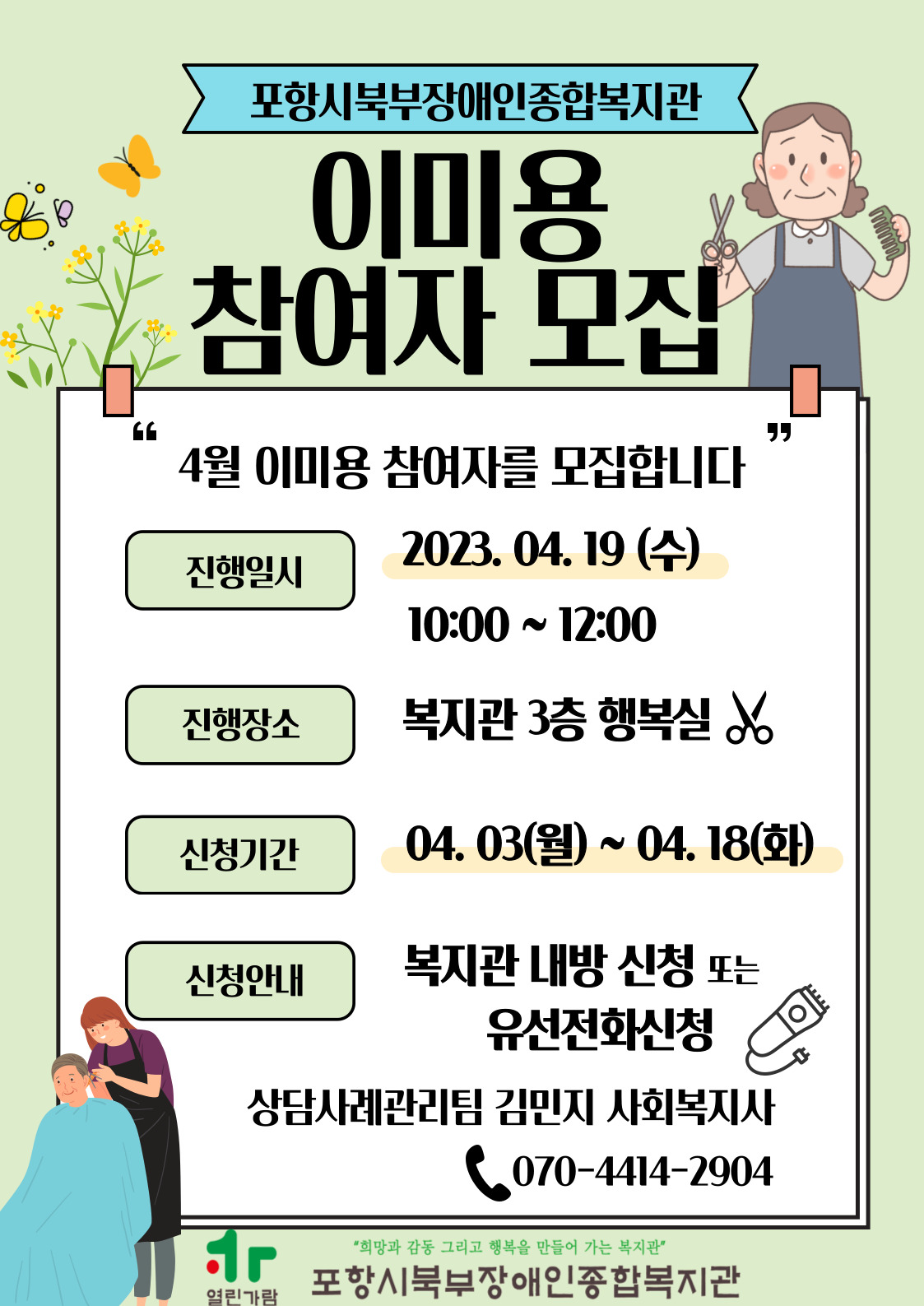 4월 이미용 참여자 모집 최고관리자 상담사례관리팀 0 840 2023.04.03 15:20 <4월 이미용 참여자 모집>* 진행일시 : 2023. 04. 19(수) 10:00 ~ 112:00* 진행장소 : 복지관 3층 행복실* 신청기간 : 04. 03 (월) ~ 04. 18(화)* 신청방법 : 복지관 내방신청 또는 유선전화신청 (상담사례관리팀 김민지 사회복지사 070-4414-2904)