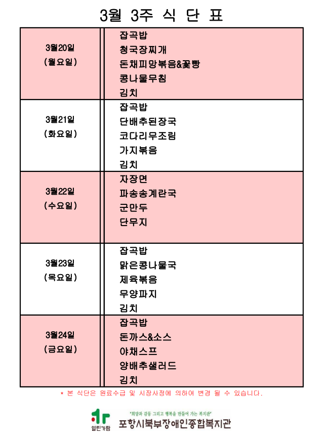 2023년 3월 3주 식단표 안내 최고관리자 기획운영팀 0 1074 2023.03.16 15:51 [2023년 3월 2주 식단표 안내]* 금주 프로그램 이용자 및 가족, 식사도움이 필요한 이용자의 보호자에 한해 식당 운영이 진행됩니다.*<03월 20일(월요일) ~ 03월 24일(금요일)>** 본 식단은 원료 수급 및 식당 사정에 따라 변경될 수 있습니다. **