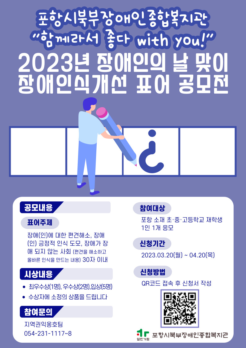 2023년 장애인의 날 맞이 장애인식개선 표어 공모전 최고관리자 지역권익옹호팀 0 893 2023.03.20 15:17 <2023년 장애인의 날 맞이 장애인식 개선 표어 공모전>* 신청기간: 2023년 03월 20일 (월) - 04월 20일(목)* 참여대상: 포항 소재 초,중,고등학교 재학생 1인 1개 응모* 참여문의: 지역권익옹호팀(054-231-1117~8)