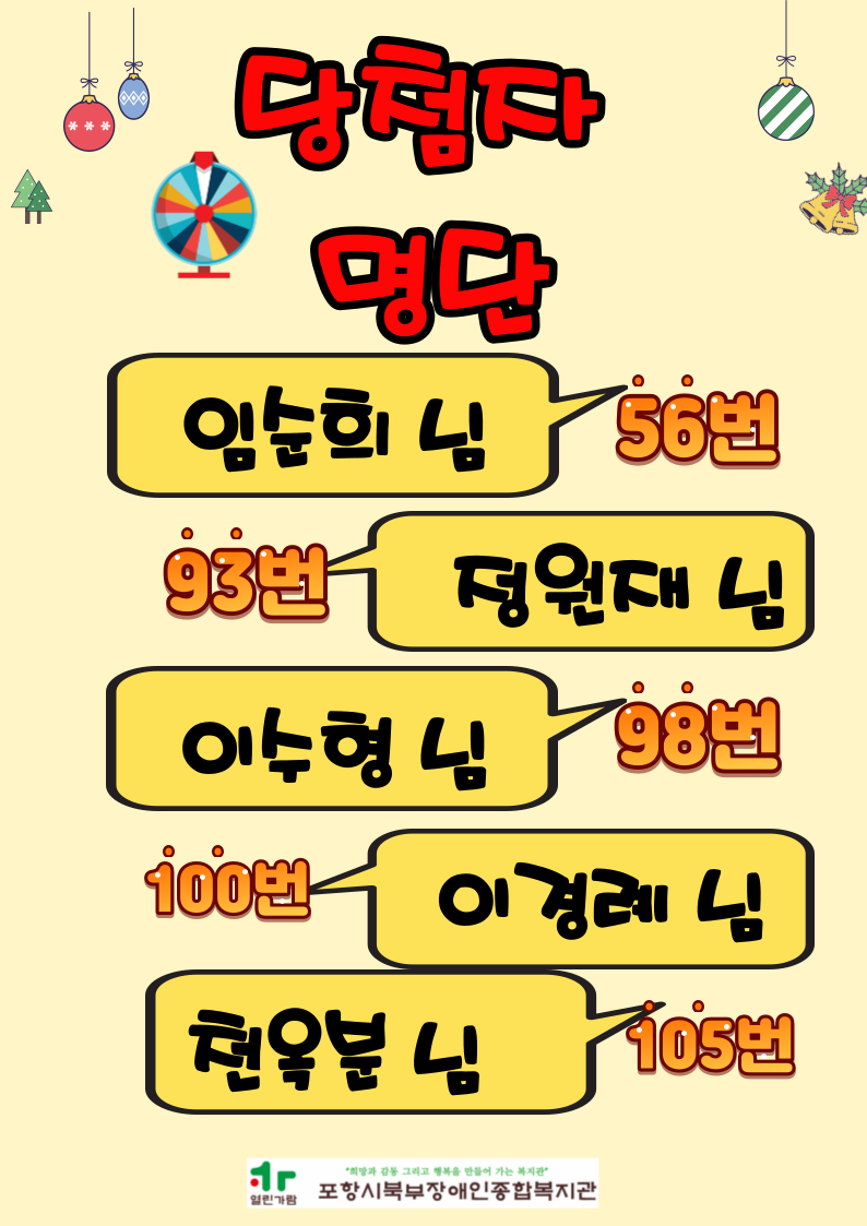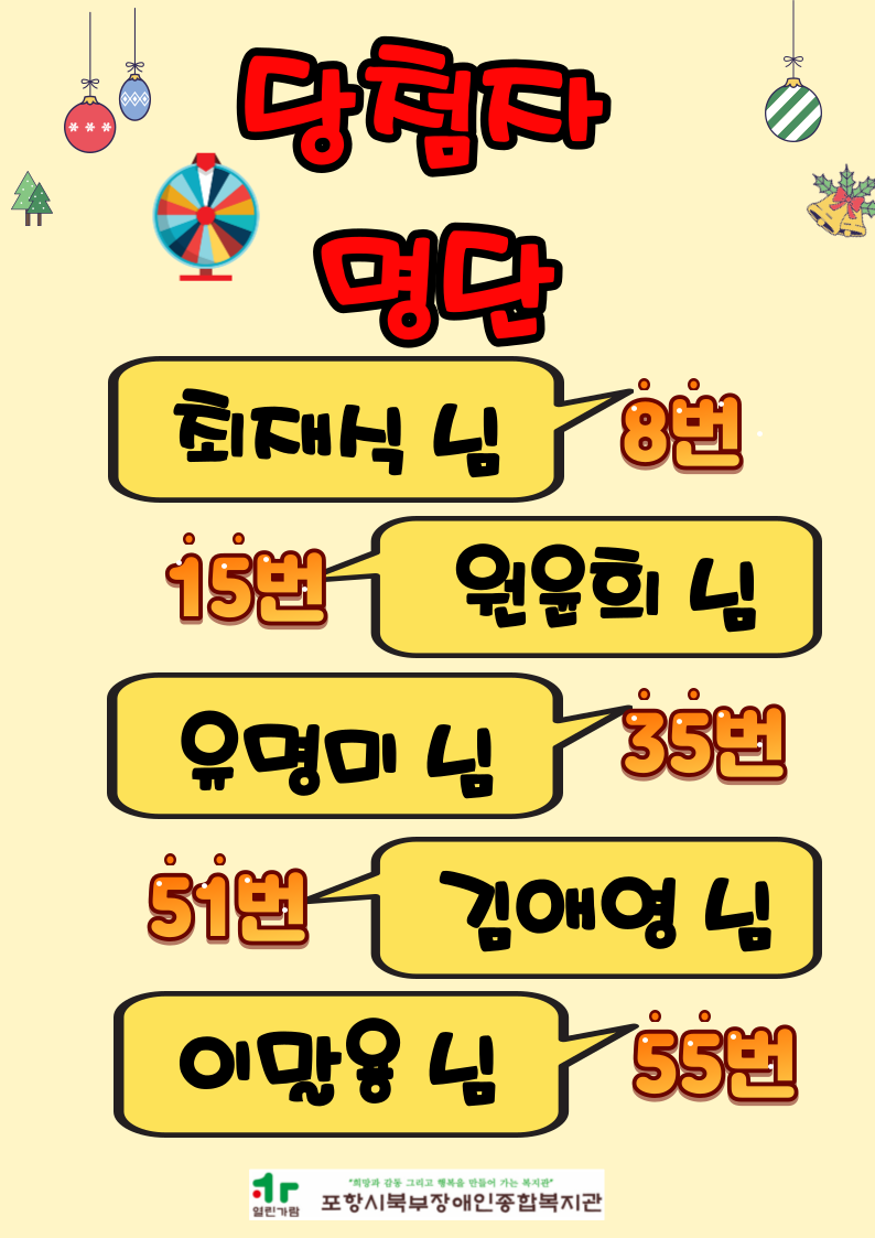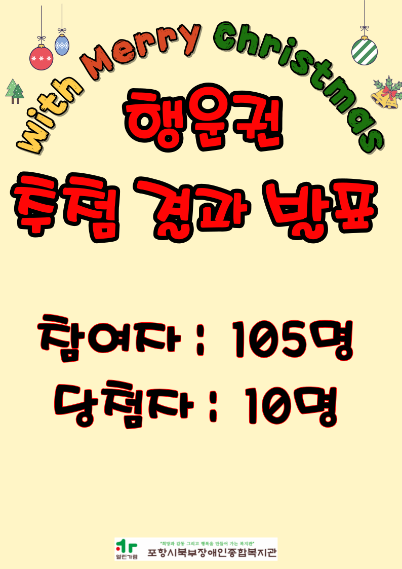 [크리스마스 행사 행운권 추첨 결과 안내] 최고관리자 기획운영팀 0 1203 2022.12.26 10:21 [크리스마스 행사 행운권 추첨 결과 안내]참여자 수 : 105명당첨자 수 : 10명당첨 방법 : (1)행운권 용지에 있는 번호 (2) 인터넷 무작위 번호 추출기 사이트 이용당첨자 명단 : 최재식, 원윤희, 유명미, 김애영, 이말용, 임순희, 정원재, 이수형, 이경례, 천옥분 님(총 10분)행운권 선물 수령 방법 : (1) 수령 일시 : 12월 26일 오후 1시 ~ 27일 오후 6시 (2) 수령 장소 : 포항시북부장애인종합복지관 사무실 or 복지관 로비 (3) 수령 문의 : 기획운영팀 김나현 사회복지사 070-4458-3075
