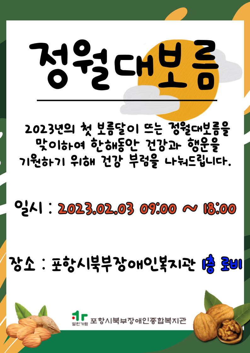 정월대보름 부럼 나눔 진행 최고관리자 기획운영팀 0 1064 2023.02.02 15:21 2023년의 첫 보름달이 뜨는 정월대보름을 맞이하여 한해동안 건강과 행운을 기원하기 위해 건강 부럼 나눔을 진행합니다. 일시 : 2023.02.03 09:00 ~ 18:00장소 : 포항시북부장앵인종합복지관 1층 로비