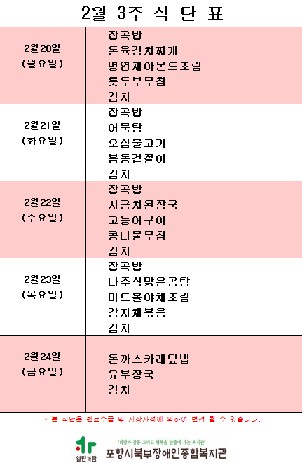 ** 본 식단은 원료 수급 및 식당 사정에 따라 변경될 수 있습니다. **