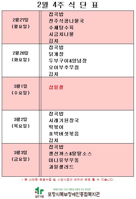 [2023년 2월 4주 식단표 안내]