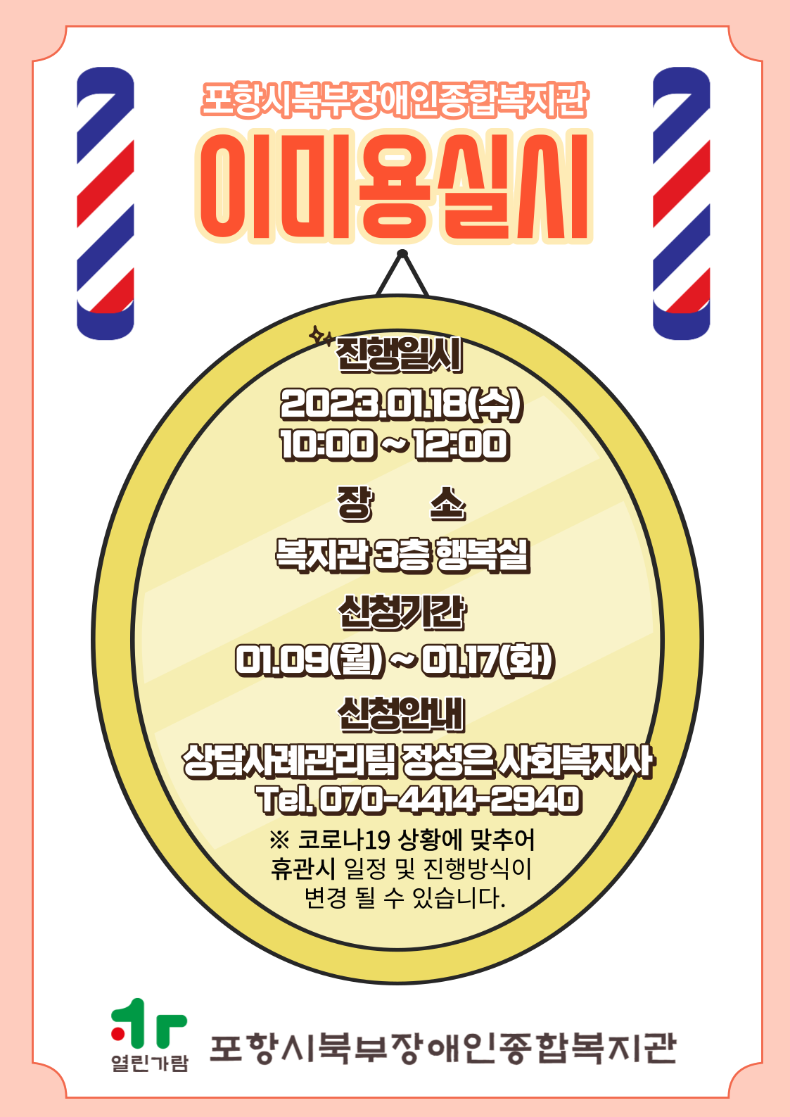 2023년 1월 이미용 신청 대상자 모집 안내 최고관리자 상담사례관리팀 0 867 2023.01.09 11:39 2023년 1월 이미용 신청 대상자 모집 안내진행일시 : 2023년 01월 18일 수요일 10:00 ~ 12:00장 소 : 복지관 3층 행복실신청기간 : 01월 09일 월요일 ~ 01월 17일 화요일 09:00 ~ 18:00신청안내 : 상담사례관리팀 정성은 사회복지사 (070-4414-2940)** 코로나 19 상황에 맞추어 휴관시 일정 및 진행방식이 변경될 수 있습니다.**