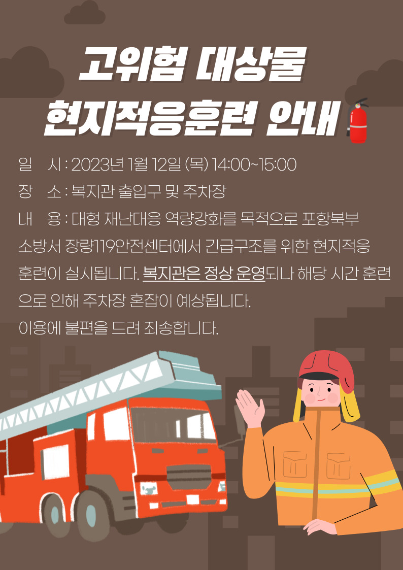고위험 대상물 현지적응훈련 안내 최고관리자 가족평생교육지원팀 0 875 2023.01.09 11:58 고위험 대상물 현지적응훈련 안내일시 : 2023년 1월 12일 목요일 14:00 ~ 15:00장소 : 복지관 출입문 및 주차장내용 : 대형 재난대응 역량강화를 목적으로 포항북부소방서 장량 119안전센터에서 긴급구조를 위한 현지적응훈련이 실시됩니다. 복지관은 정상 운영되나 해당 시간 훈련으로 인해주차장 혼잡이 예상됩니다.이용에 불편을 드려 죄송합니다.