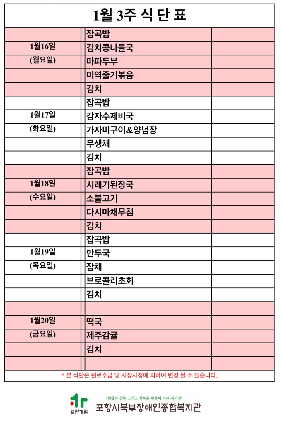 [2023년 1월 3주 식단표 안내] 최고관리자 기획운영팀 0 1142 2023.01.16 14:16 [2023년 1월 3주 식단표 안내]* 금주 프로그램 이용자 및 가족, 식사도움이 필요한 이용자의 보호자에 한해 식당 운영이 진행됩니다.*ex) 01월 16일(월요일) ~ 01월 20일(금요일) 프로그램 이용자 및 보호자** 본 식단은 원료 수급 및 식당 사정에 따라 변경될 수 있습니다. **