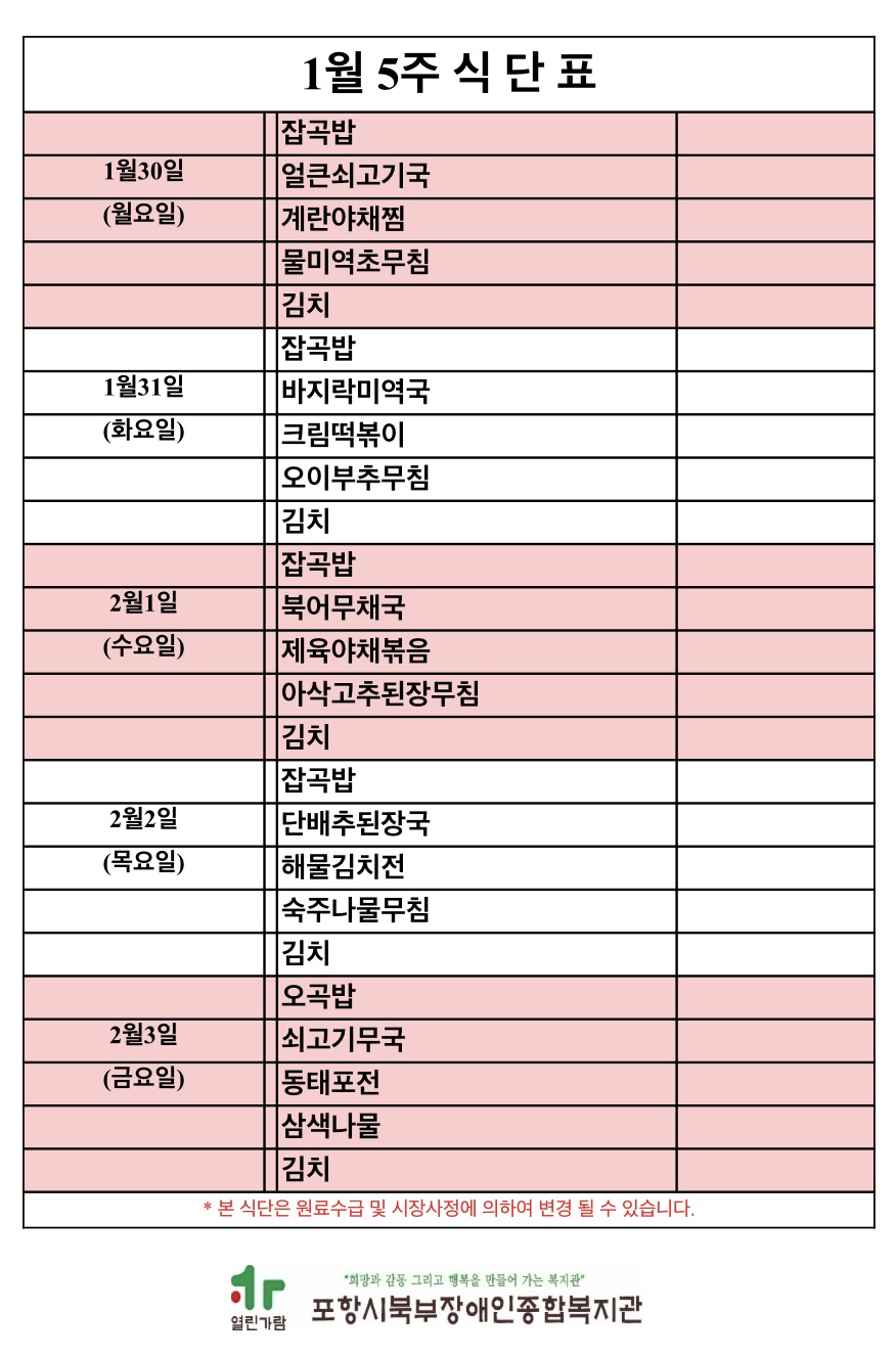 2023년 1월 5주 식단표 안내 최고관리자 기획운영팀 0 1157 2023.01.27 13:25 [2023년 1월 5주 식단표 안내]* 금주 프로그램 이용자 및 가족, 식사도움이 필요한 이용자의 보호자에 한해 식당 운영이 진행됩니다.*ex) 01월 30일(수요일) ~ 02월 03일(금요일) 프로그램 이용자 및 보호자** 본 식단은 원료 수급 및 식당 사정에 따라 변경될 수 있습니다. **