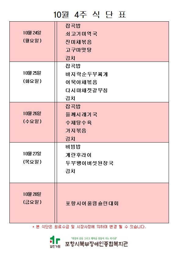 [10월 4주 식단표 안내]