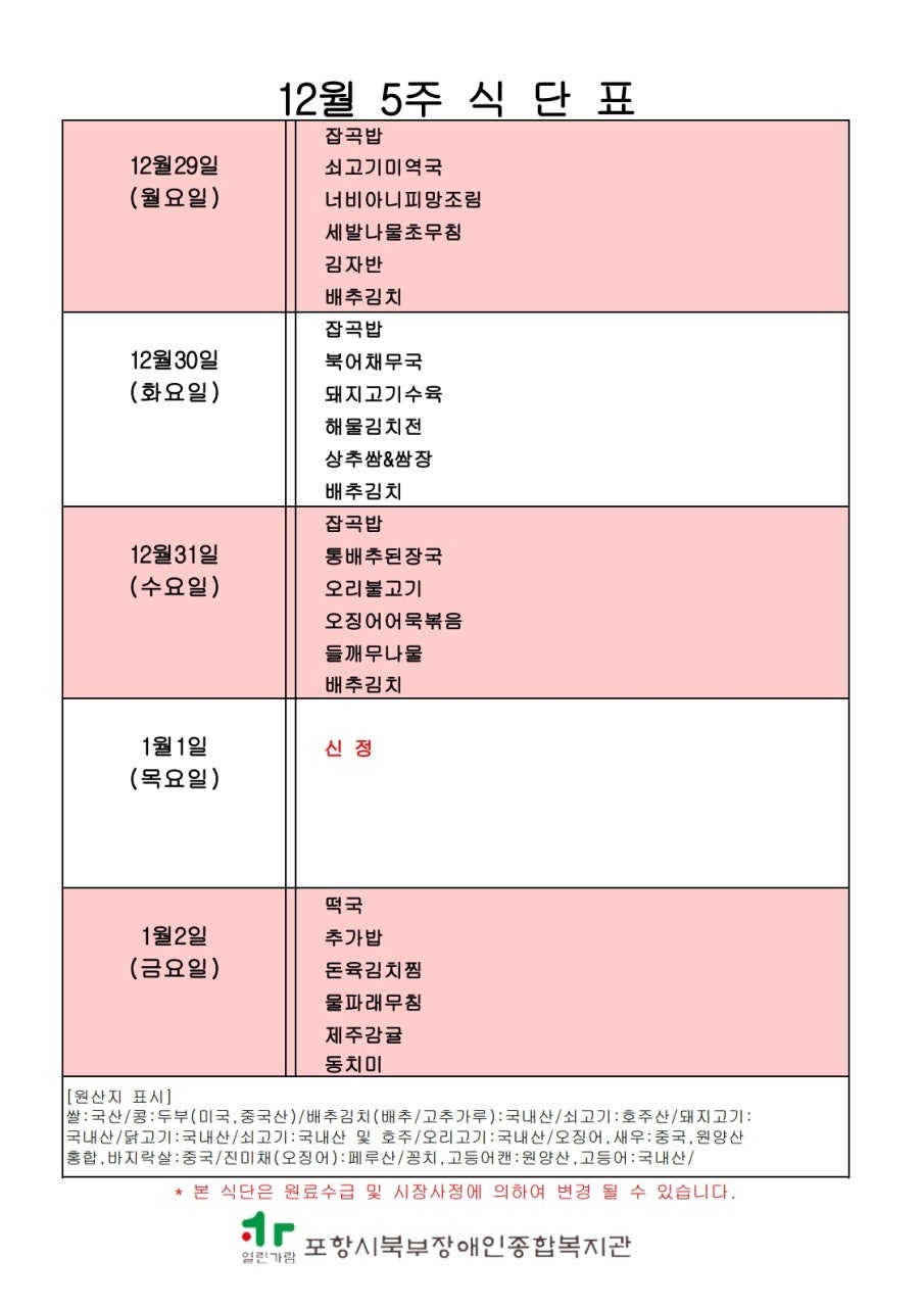 [2025년 12월 5주 식단표 안내]