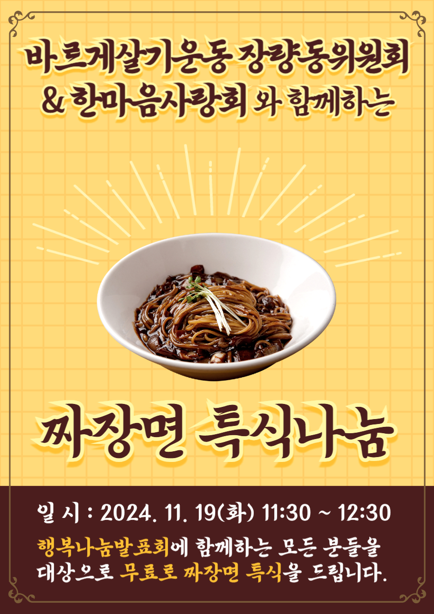 <행복나눔발표회 특식나눔 안내> 최고관리자 지역사회서비스팀 0 528 2024.11.18 10:48 바르게살기운동 장량동위원회 & 한마음사랑회 와 함께하는 짜장면 특식나눔- 일시 : 2024. 11. 19(화) 11:30~12:30- 행복나눔발표회에 함께하는 모든 분들을 대상으로 무료로 짜장면 특식을 드립니다