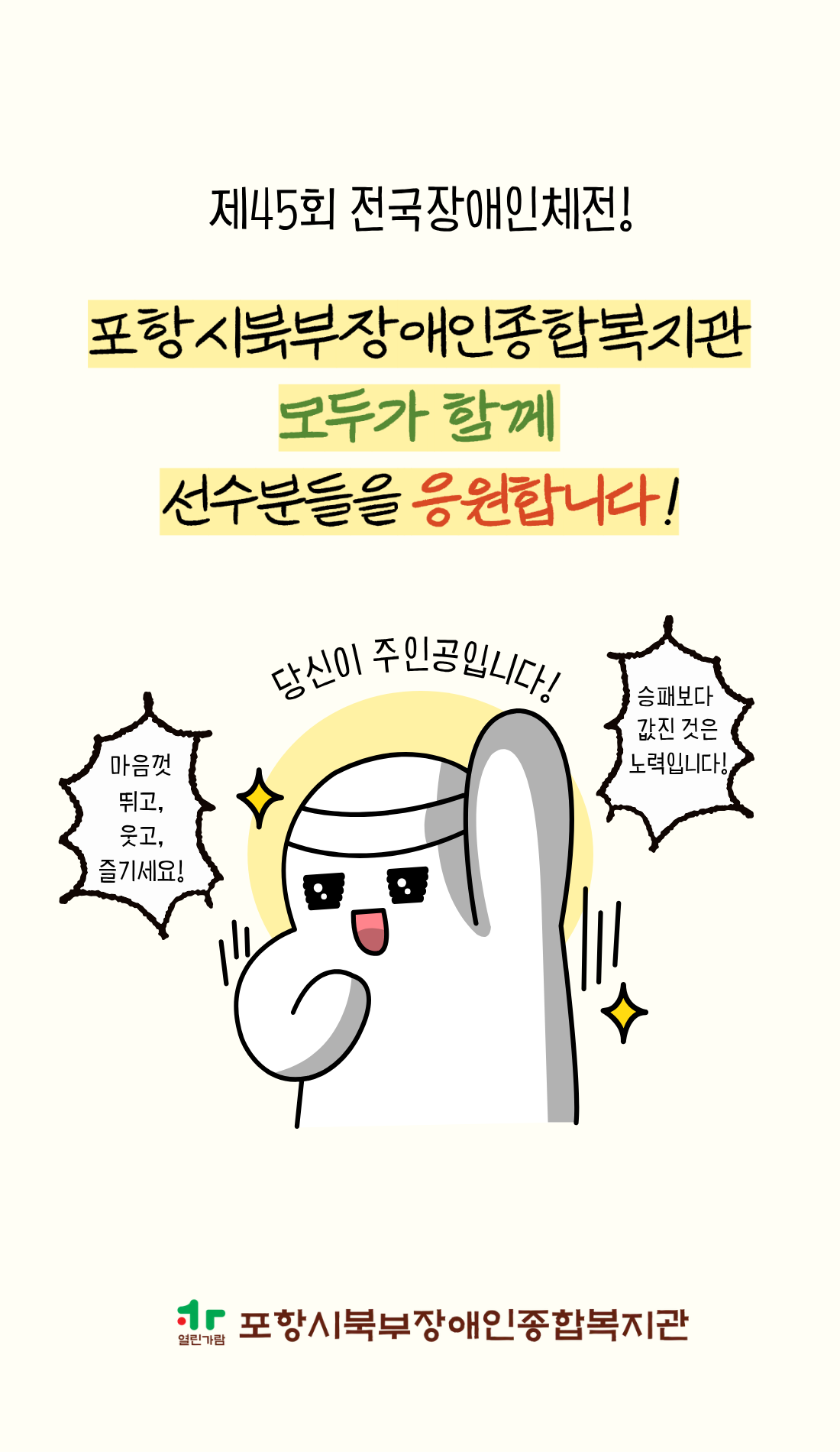 제45회 전국장애인체육대회 선수분들을 응원합니다! 최고관리자 사회참여지원팀 0 173 10.24 15:23 제45회 전국장애인체육대회가 오는 10월 31일부터~11월 5일까지 부산광역시에서 진행됩니다.우리 복지관에서는 배드민턴, 탁구, 볼링, 슐런, 파크골프, 수영, 역도 종목에 역대 최다 인원인 총 19명의 선수들이 대회에 참가합니다. 경상북도를 대표해서 대회에 출전하는 선수들을 위해 경기 잘 하고 오라고 이용자분들의 많은 격려와 응원 부탁드립니다.