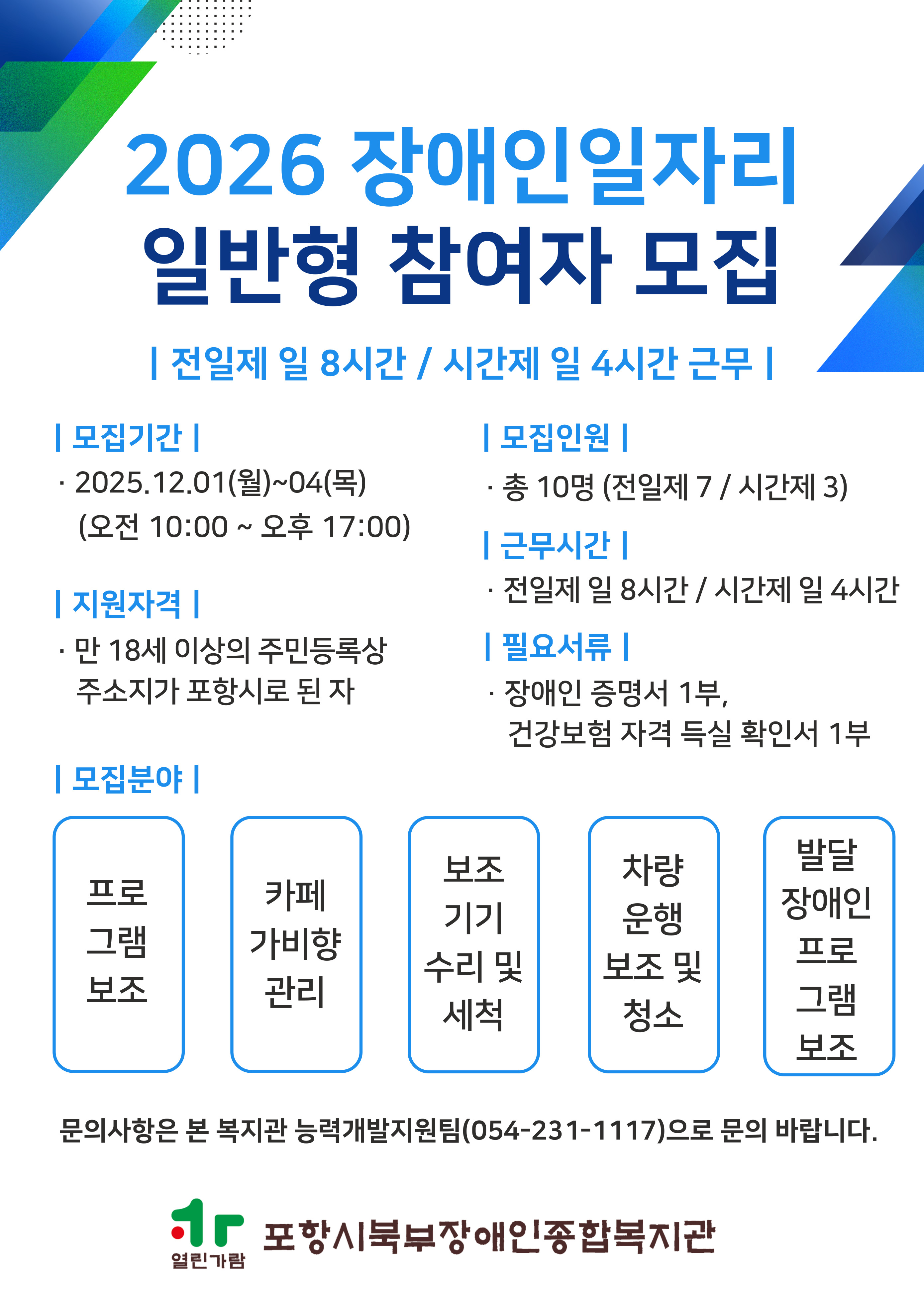 2026년 장애인일자리사업 일반형 참여자 모집 공고를 아래와 같이 실시하고자 합니다.