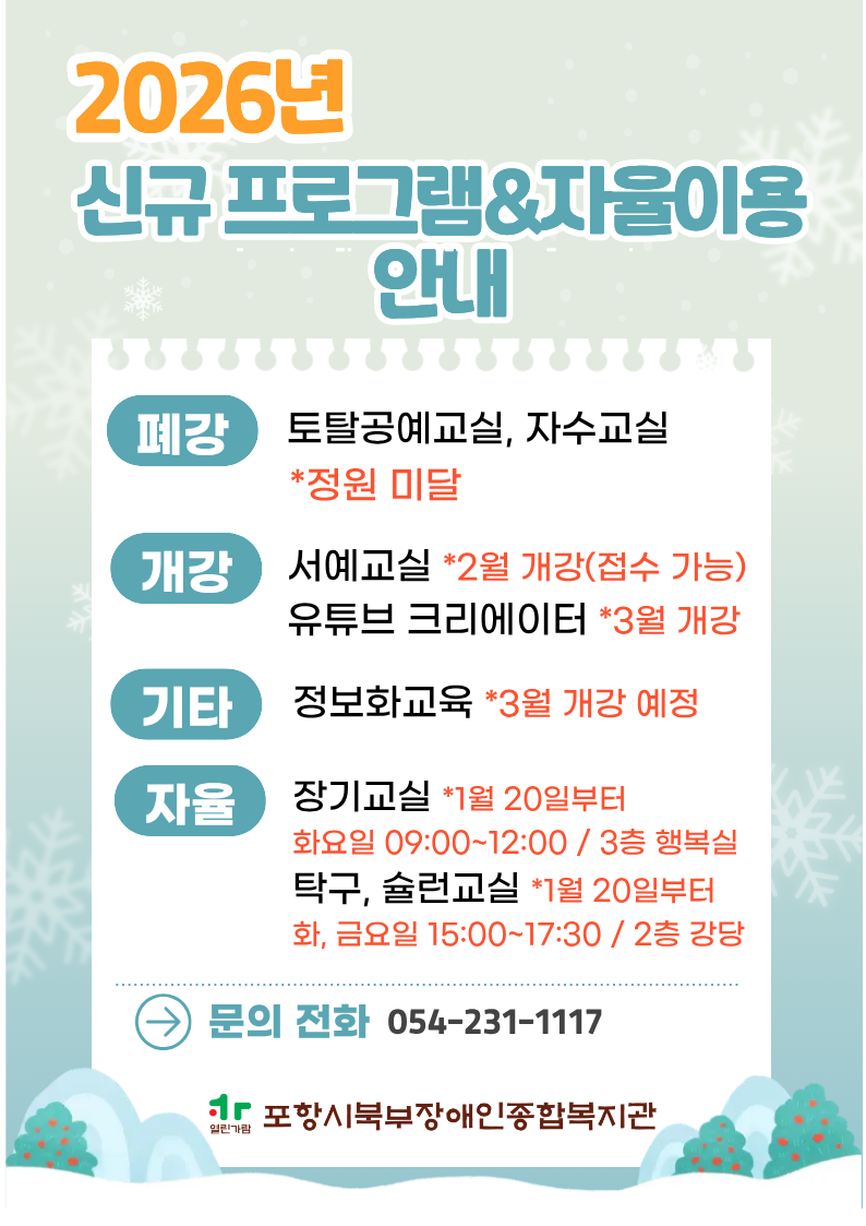 2026년 신규 프로그램&자율이용 안내 최고관리자 사회참여지원팀 0 99 01.15 11:39 [2026년 신규 프로그램&자율이용 안내]- 폐강 : 토탈공예교실, 자수교실 (정원 미달)- 개강 : 서예교실 (2월 개강) 유튜브 크리에이터 (3월 개강) 집합정보화교육 (3월 개강)- 자율이용 : 장기교실 (1월 20일부터 매주 화요일 09:00~12:00, 3층 행복실) *상시 자율이용 : 1층 휴게실, 3층 로비 탁구교실, 슐런교실 (1월 20일부터 매주 화요일, 금요일 15:00~17:30, 2층 강당) -문의전화 : 054-231-1117
