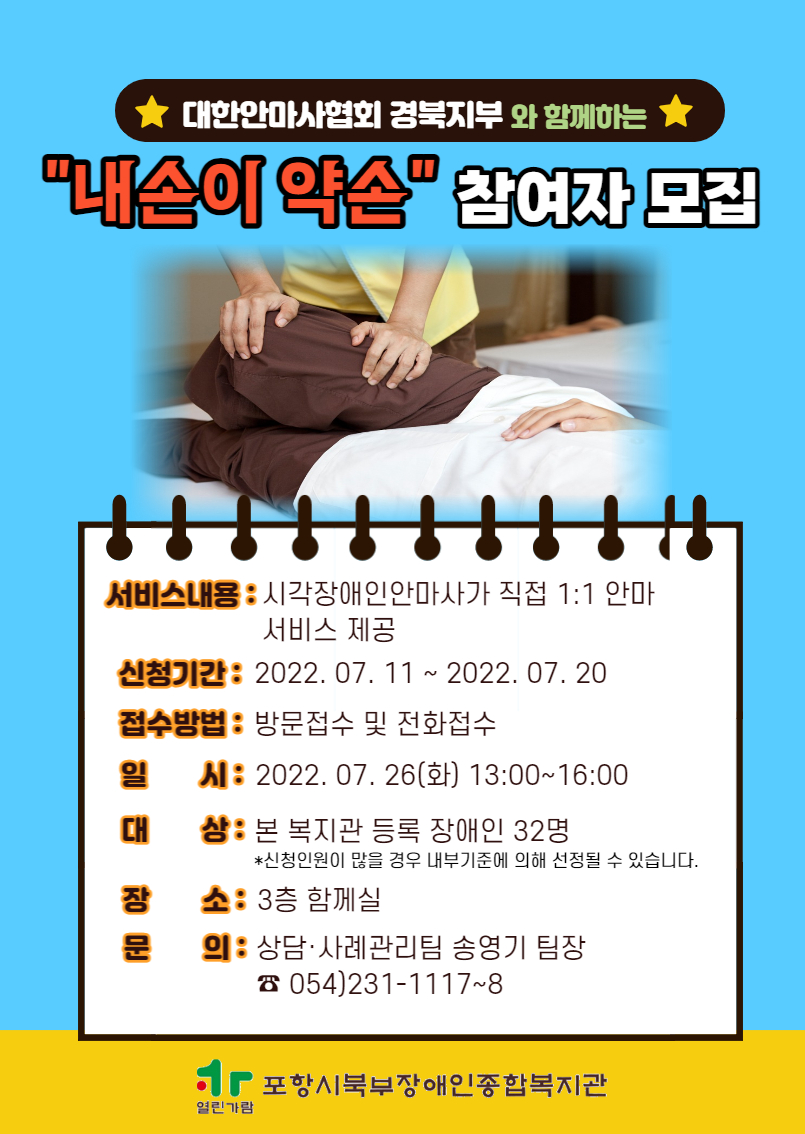 대한안마사협회 경북지부와 함께하는 '내손이 약손' 참여자 모집 안내 최고관리자 0 627 2022.07.11 17:56 [대한안마사협회 경북지부와 함께하는 '내손이 약손' 참여자 모집 안내]서비스내용: 시각장애인안마사가 직접 1:1 안마서비스 제공신청기간: 2022. 07. 11 ~ 07. 20접수방법: 방문접수 및 전화접수일시: 2022. 07. 26(화) 13:00~16:00대상: 본 복지관 등록 장애인 32명**신청인원이 많을 경우 내부기준에 의해 선정될 수 있습니다.장소: 3층 함께실문의: 상담사례관리팀 팀장 송영기(054-231-1117~8)