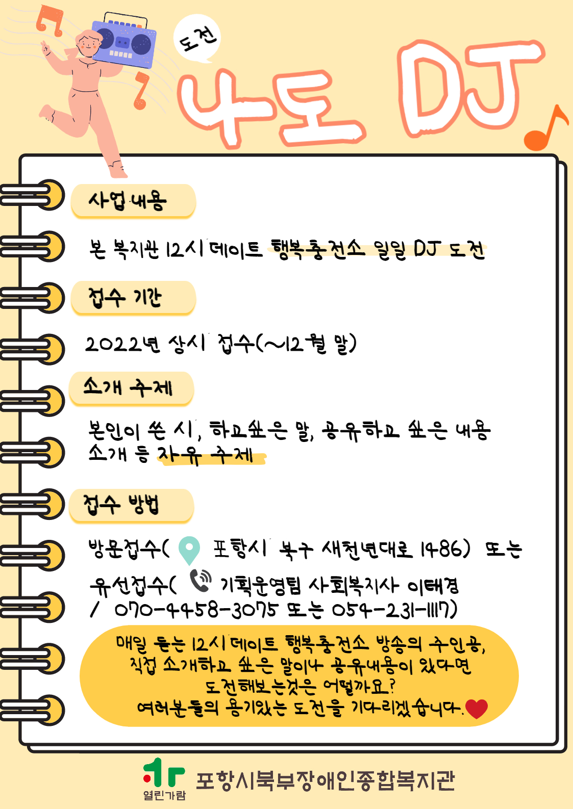 우리 모두 12시데이트 행복충전소의 주인공이 될 수 있다. - 도전 나도 DJ 최고관리자 0 639 2022.07.26 12:40 [우리 모두 12시데이트 행복충전소의 주인공이 될 수 있다. - 도전 나도 DJ]사업내용: 본 복지관 12시데이트 행복충전소 일일 DJ도전접수기간: 2022년 상시 접수(~12월 말)소개주제: 본인이 쓴 시, 하고싶은 말, 공유하고 싶은 내용 등 자유주제 소개접수방법: 방문접수 또는 유선전화 및 댓글 접수 (기획운영팀 사회복지사 이태경 / 070-4458-3075)