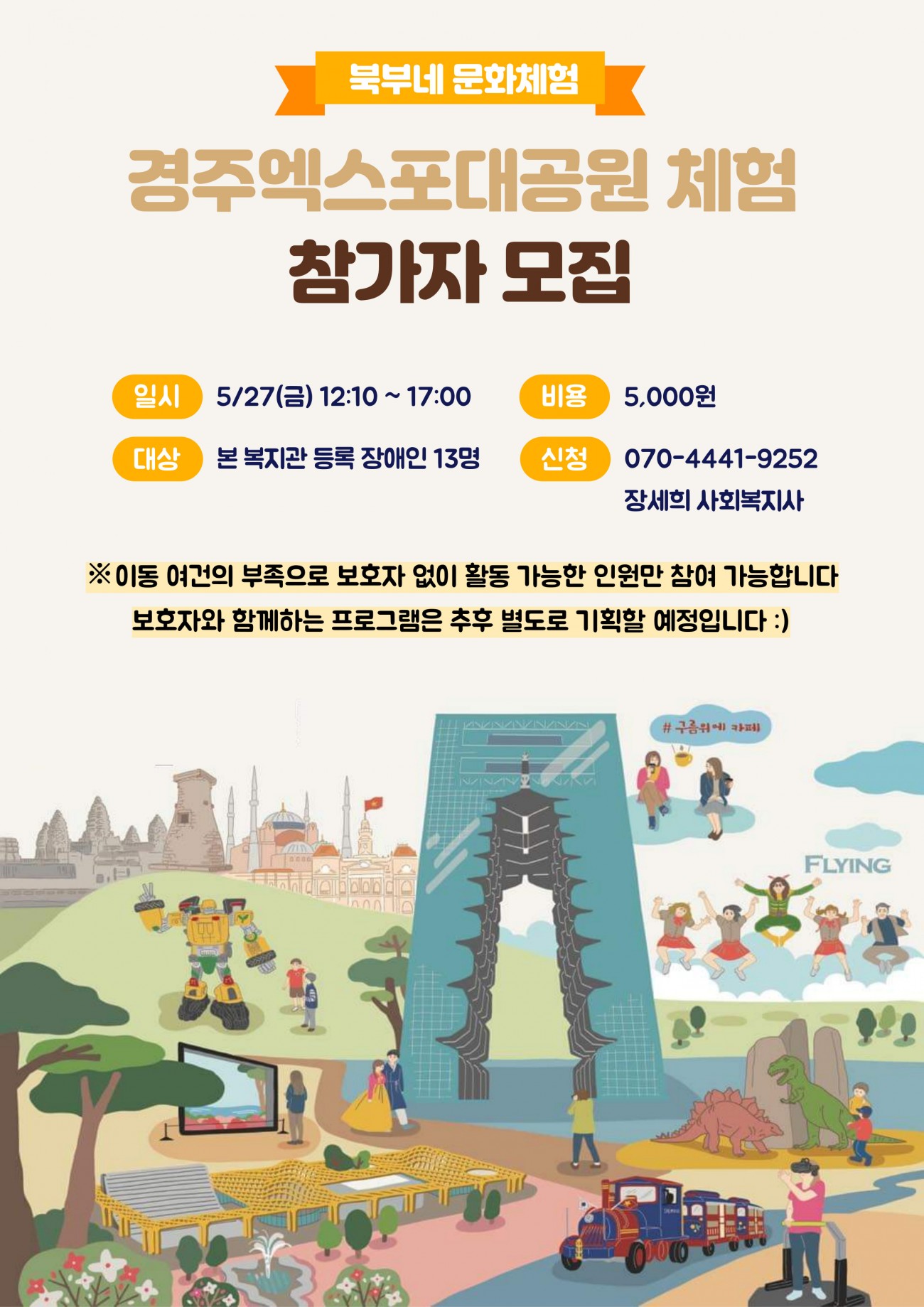 부네 문화체험 '경주엑스포대공원 체험' 참가자 모집 최고관리자 0 809 2022.05.24 09:38 [북부네 문화체험 '경주엑스포대공원 체험' 참가자 모집]○ 일시 : 5/27(금) 12:10 ~ 17:00○ 대상 : 본 복지관 등록 장애인 13명○ 비용 : 5,000원○ 신청 : 070-4441-9252, 장세희 사회복지사※ 이동 여건의 부족으로 보호자 없이 활동 가능한 인원만 참여 가능합니다.보호자와 함꼐하는 프로그램은 추후 기획 예정입니다 :)