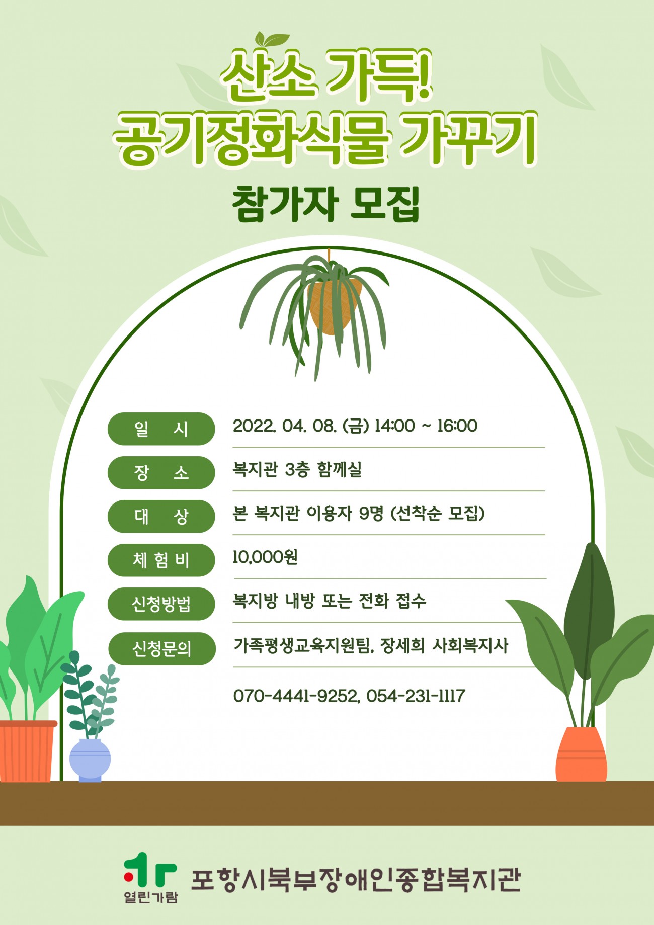 산소 가득! 공기정화식물 가꾸기 참가자 모집 최고관리자 0 726 2022.03.30 17:34 [산소 가득! 공기정화식물 가꾸기 참가자 모집] 식목일 주간을 맞아 원예 강사와 함께 공기정화식물을 알아보고이쁜 화분도 가꿔볼 이용자를 모집합니다.일시 : 2022. 04. 08. (금) 14:00 ~ 16:00장소 : 본 복지관 3층 함께실대상 : 본 복지관 이용자 9명(선착순 모집)이용료 : 10,000원신청문의 : 가족평생교육지원팀, 장세희 사회복지사070-4441-9252, 054-231-1117