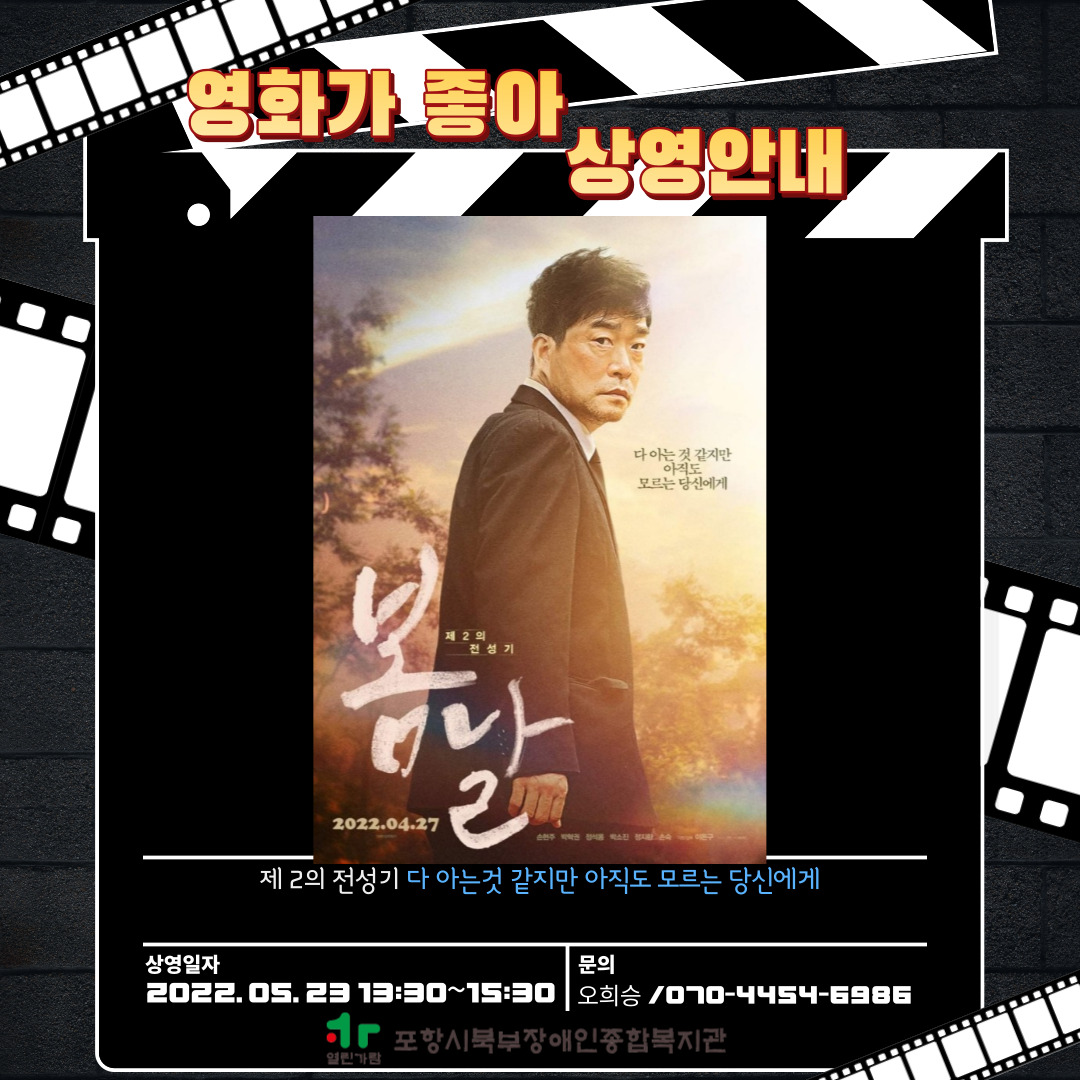 영화가 좋아 상영 안내 최고관리자 0 823 2022.05.19 17:48 [영화가 좋아 상영 안내]상영일자: 2022.05.23(월) 13:00 ~ 15:30신청 및 문의 전화: 가족평생교육지원팀 선임 사회복지사 오희승(070-4454-6986)