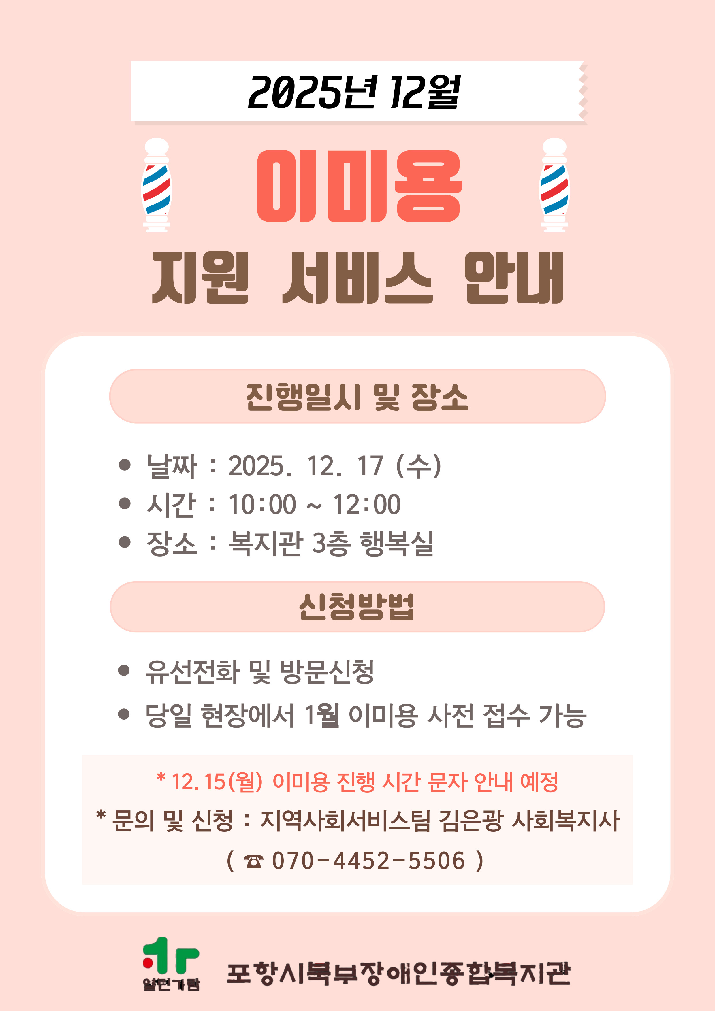 12월 이미용 지원 서비스 안내 최고관리자 0 32 12.03 10:56 <12월 이미용 지원 서비스 안내>* 진행일시 : 2025. 12. 17(수) 10:00 ~ 12:00* 진행장소 : 복지관 3층 행복실* 신청기간 : 2025. 12. 01(월) ~ 12. 17(수)- 12. 15(월) 개인별 미용 시간을 문자로 안내해드릴 예정입니다.- 이미용 진행 당일 사전 접수대장에 성함, 전화번호, 원하는 시간을 적어주시면 1월 이미용 접수가 가능합니다.*문의: 지역사회서비스팀 김은광 사회복지사(070-4452-5506)