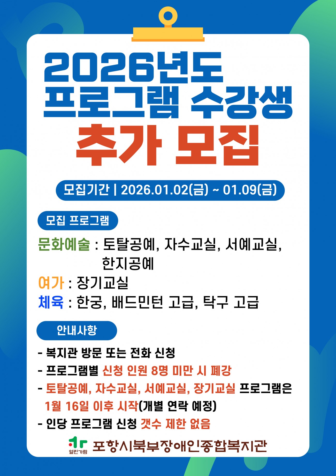 2026년도 프로그램 수강생 추가 모집 안내 최고관리자 0 72 01.02 12:39 [2026년도 프로그램 수강생 추가 모집 안내]ㅇ 모집기간 : 2026. 01. 02(금) ~ 01. 09(금)ㅇ 모집프로그램 - 문화예술 : 토탈공예, 자수교실, 서예교실, 한지공예 - 여가 : 장기교실 - 체육 : 한궁, 배드민턴 고급, 탁구 고급ㅇ 안내사항 - 복지관 방문 또는 전화신청 - 프로그램별 신청인원 8명 미만 시 폐강 - 토탈공예, 자수교실, 서예교실, 장기교실 프로그램은 1월 16일 이후 시작(선발자 개별 연락 예정) - 인당 프로그램 신청 갯수 제한 없음