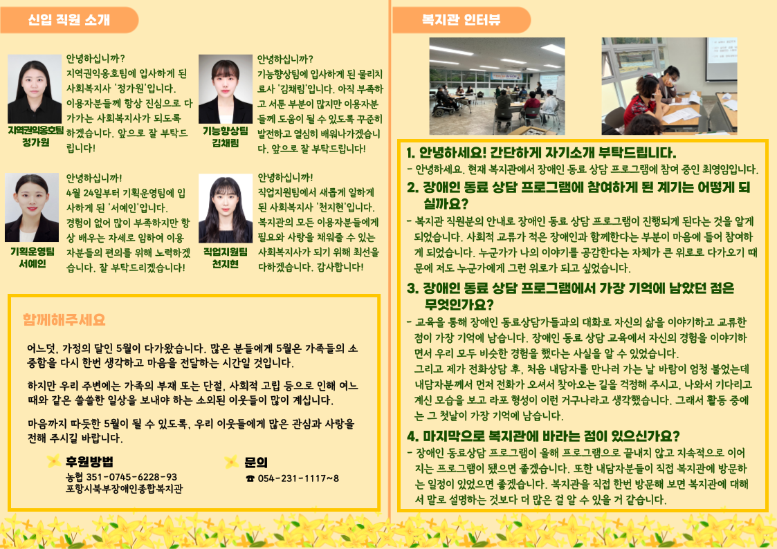 2023년 봄 행복충전소 최고관리자 0 1042 2023.05.09 15:01 [2023년 봄 행복충전소 발간]포항시북부장애인종합복지관 소식지 '행복충전소'가 발간 되었습니다! 우리 복지관의 봄 이야기를 만나보세요^^